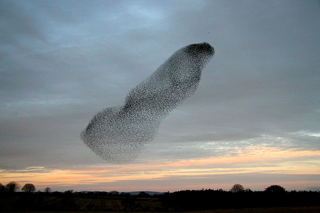 (Photo from Wikimedia Commons. Attribution: Walter Baxter / A wedge of starlings. Licensed for reuse under the Creative Commons Attribution-ShareAlike 2.0 license.)*